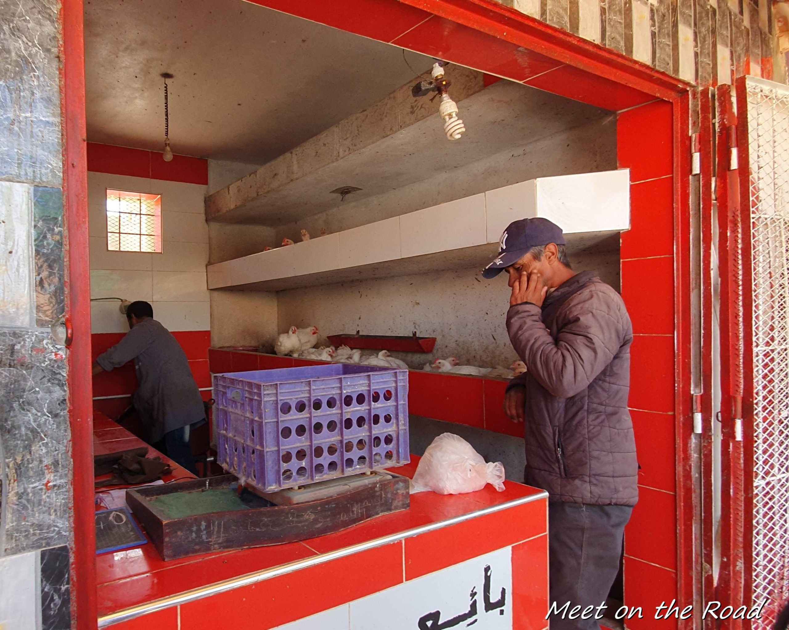 Il n’y a pas plus frais ! Chaque échoppe vend une catégorie de viande. Nous trouvons les poulets. Ils sont bien vivants…En une dizaine de minutes, le poulet est tué, plumé et découpé !
