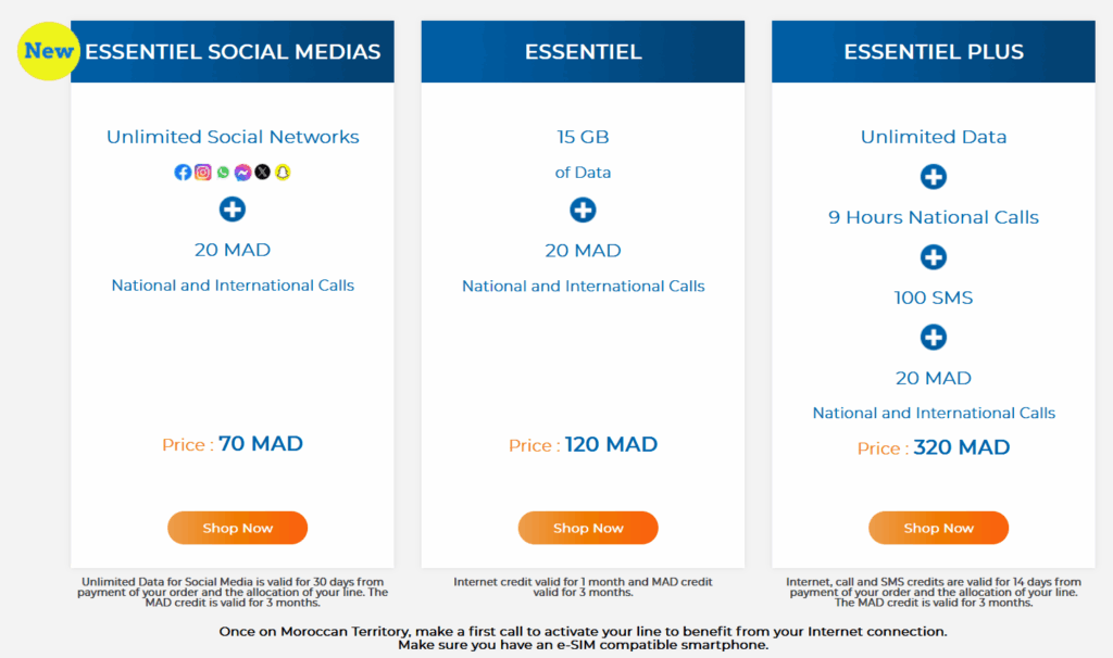 Mise à jour 2025 : Maroc Telecom fait maintenant des E-Sim pour les touristes. Votre smartphone doit être compatible E-Sim. Il y existe 3 forfaits différents, à choisir selon votre utilisation.